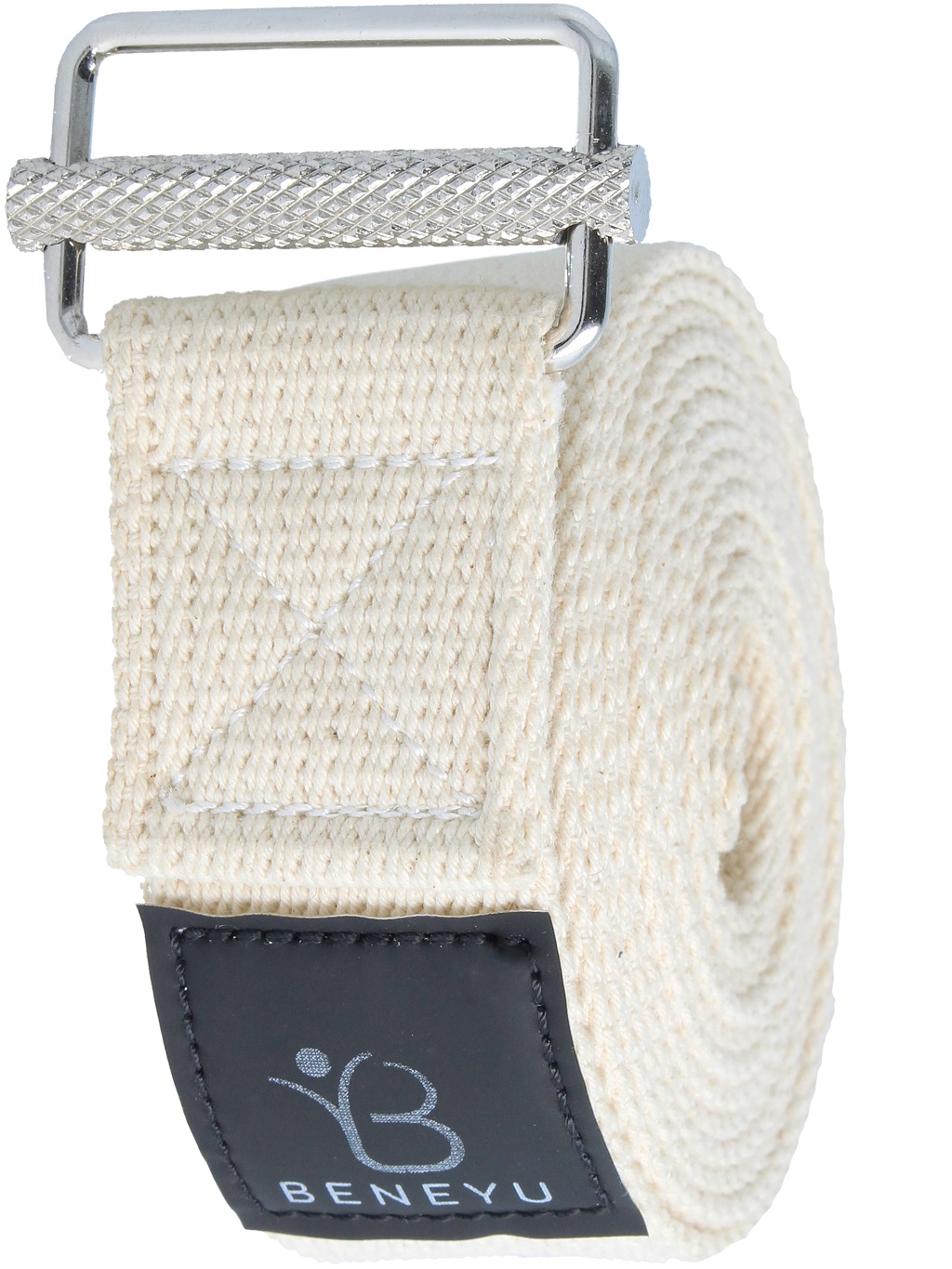 Ein weißer Yoga Gurt mit einer Metall-schnalle liegt aufgerollt vor einem freigestellten Hintergrund in weiß.